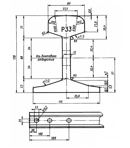 Рельсовый металлопрокат типа Р33 производится в соответствии с ТУ 14-2Р-383-2004, который определяет изделие как рельс рудничный для шахтных проводников, укладываемый на деревянные шпалы. Высота прокатного изделия составляет 128 мм., ширина подошвы 110 мм., толщина шейки 12 мм., ширина головки 60 мм. Железнодорожный рельс Р33 отпускается клиентам в зависимости от тоннажа приобретаемой партии проката, принимая во внимание, что вес одного погонного метра равен 33,42 кг. Наиболее распространенная мерная длина фасонного металлопроката Р33 – 8 метров, что эквивалентно 267,36 кг. При необходимости у нас можно заказать изделия немерной длины – от 6 метров, а также выполнить любую дополнительную обработку изделия (сверление, резку и пр.)